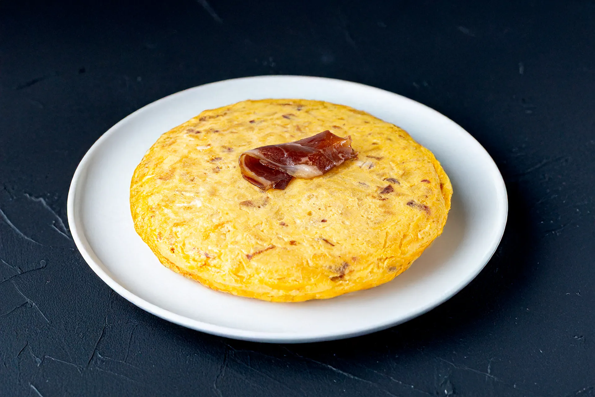 Tortilla cecina, queso cabra y un punto de cebolla pochada